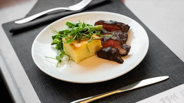 See what you fancy from the fine dining menu on your table. Then place your order with your onboard host. Will it be two or three courses?